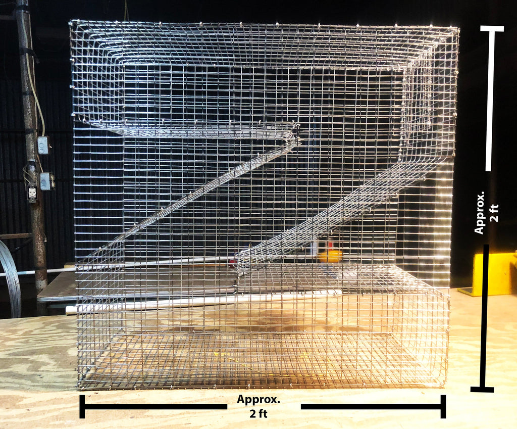DIMENSIONS: The dimensions are approximately 2 ft (length) x 2 ft (height) x 11.5 in (width), with the four fish entry points being 1 in by 3 in each. This trap is legal on most public lakes, but be sure to check your local regulations before ordering