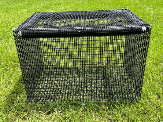 Our fish cages are DURABLE as they are made from 16 gauge welded wire in either a galvanized or PVC-coated finish, and are fastened with stainless steel hog rings for added strength. Simply put, these fish holding cages will protect your catch from predators until you're ready to clean them. To date, we have yet to have a customer contact us to inform us that an otter, raccoon, or any other predator was able to get inside their cage and kill their catch. The 16 gauge wire and stainless steel fasteners are durable enough that a grown man could not pull it apart with his bare hands.